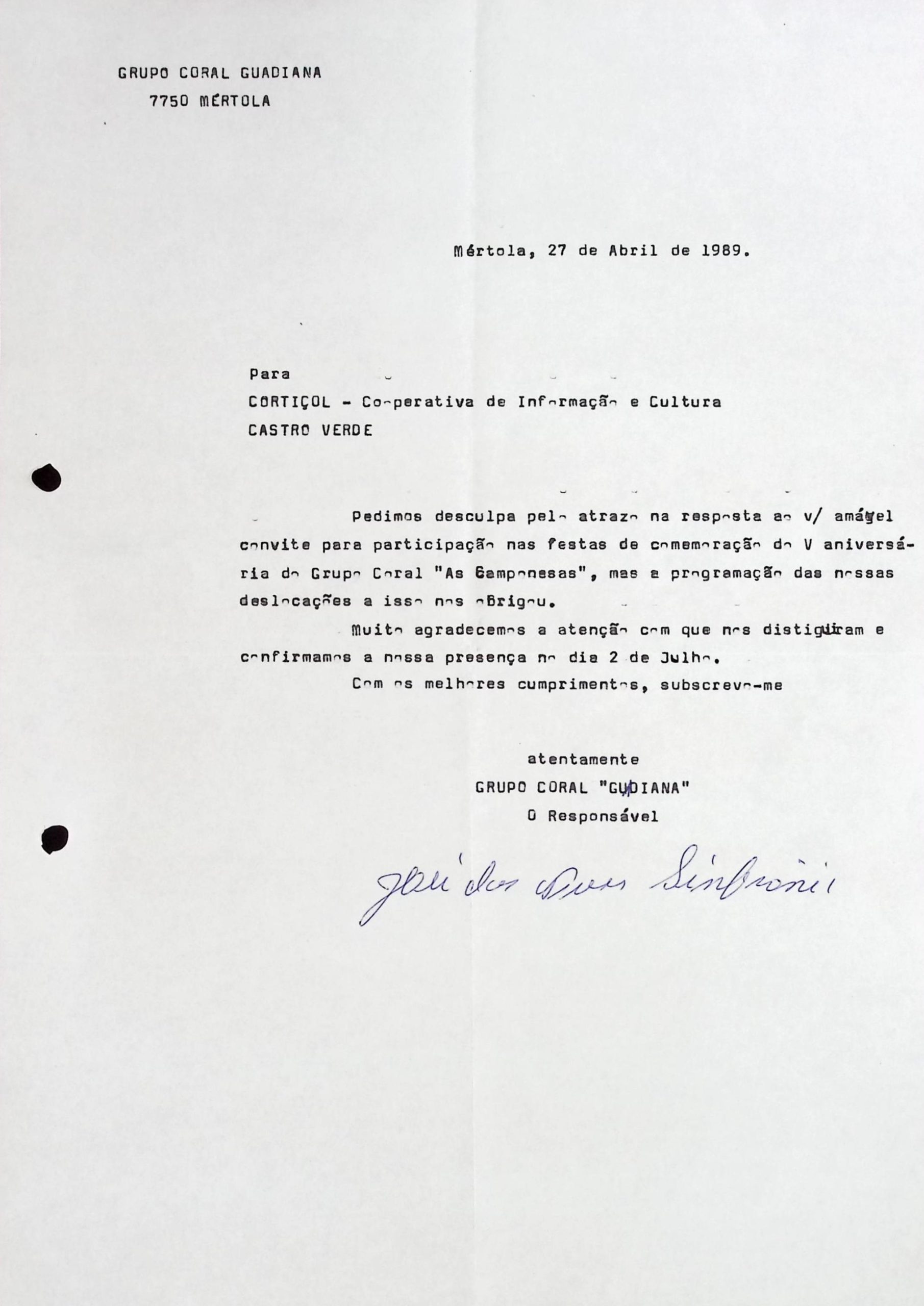 LOCALIZAÇÃO DOC. ORIGINAL Grupo Coral Feminino As Camponesas de Castro Verde Âmbito e Conteudo: Confirmação ao Grupo Coral As Camponesas de Castro Verde da disponibilidade para aceder ao convite para participar nas Comemorações do V Aniversário do Grupo Localização documento original : Documento consta do Arquivo Documental do Grupo Coral As Camponesas de Castro Verde, à guarda da Cortiçol, CRL- Cooperativa de Informação e Cultura de Castro Verde
