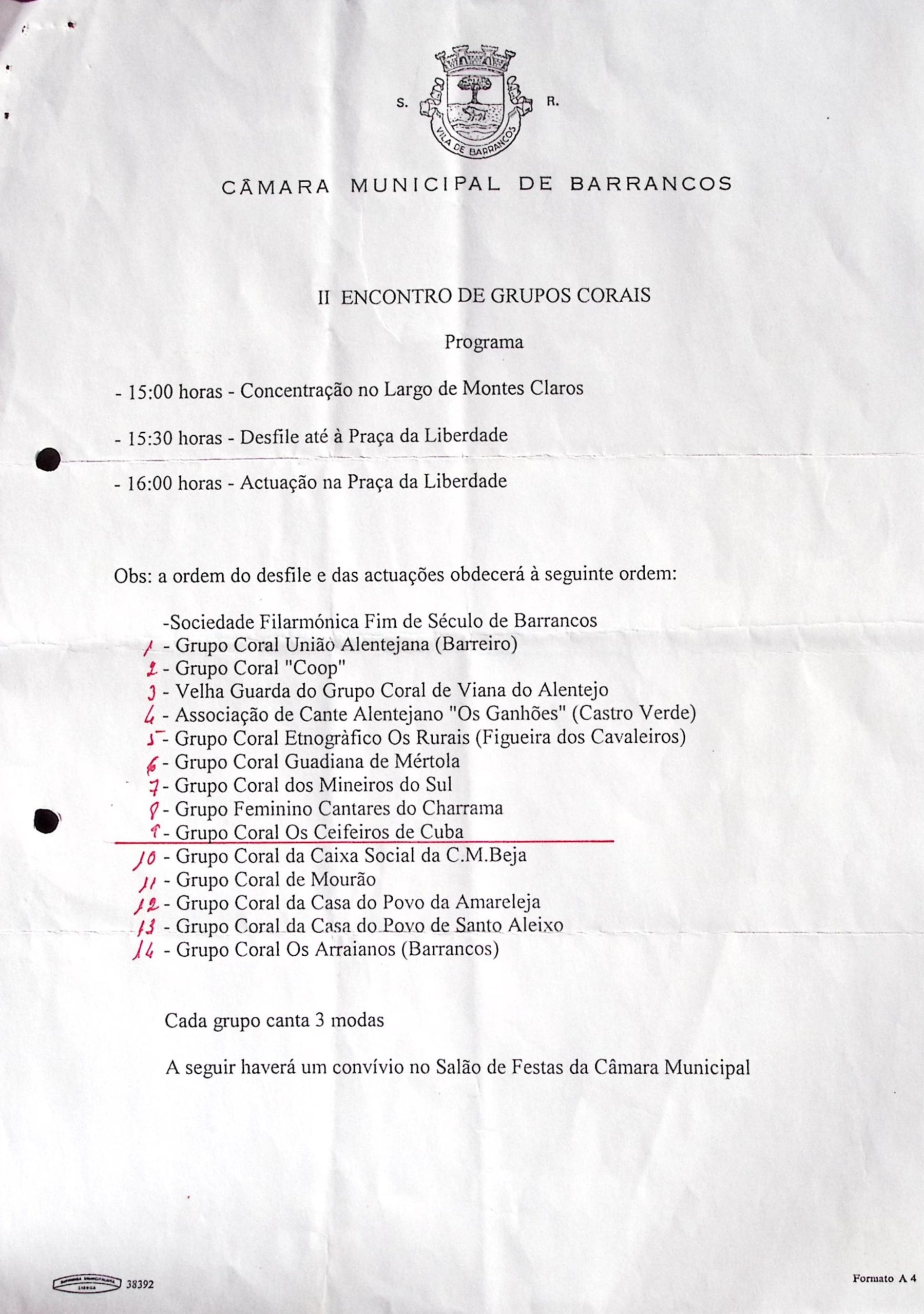 LOCALIZAÇÃO DOC. ORIGINAL Programa do II Encontro de Grupos Corais em Barrancos, que teve lugar em 15 de Agosto de 1996. Este documento é parte de um oficio enviado ao Grupo Coral Os Ceifeiros de Cuba, dando conta dos horários e ordem de atuação dos grupos. O documento original consta do Arquivo do Grupo Coral Os Ceifeiros de Cuba.